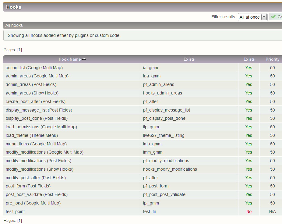 Same plugin, but viewing all the hooks in one big list. test_hook, which is an arbitrary hook, has no remove box. The chance of this changing is quite small, even though it's a glitch.
